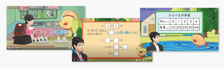 思える工夫がいっぱい玉井式独自のアニメーションを用いた授業で楽しく学習。立体の展開や回転、文章題の意味など、動きや音声を通してイメージで理解することができるため、抽象的な内容もイメージが頭の中で再生できるようになっていきます。