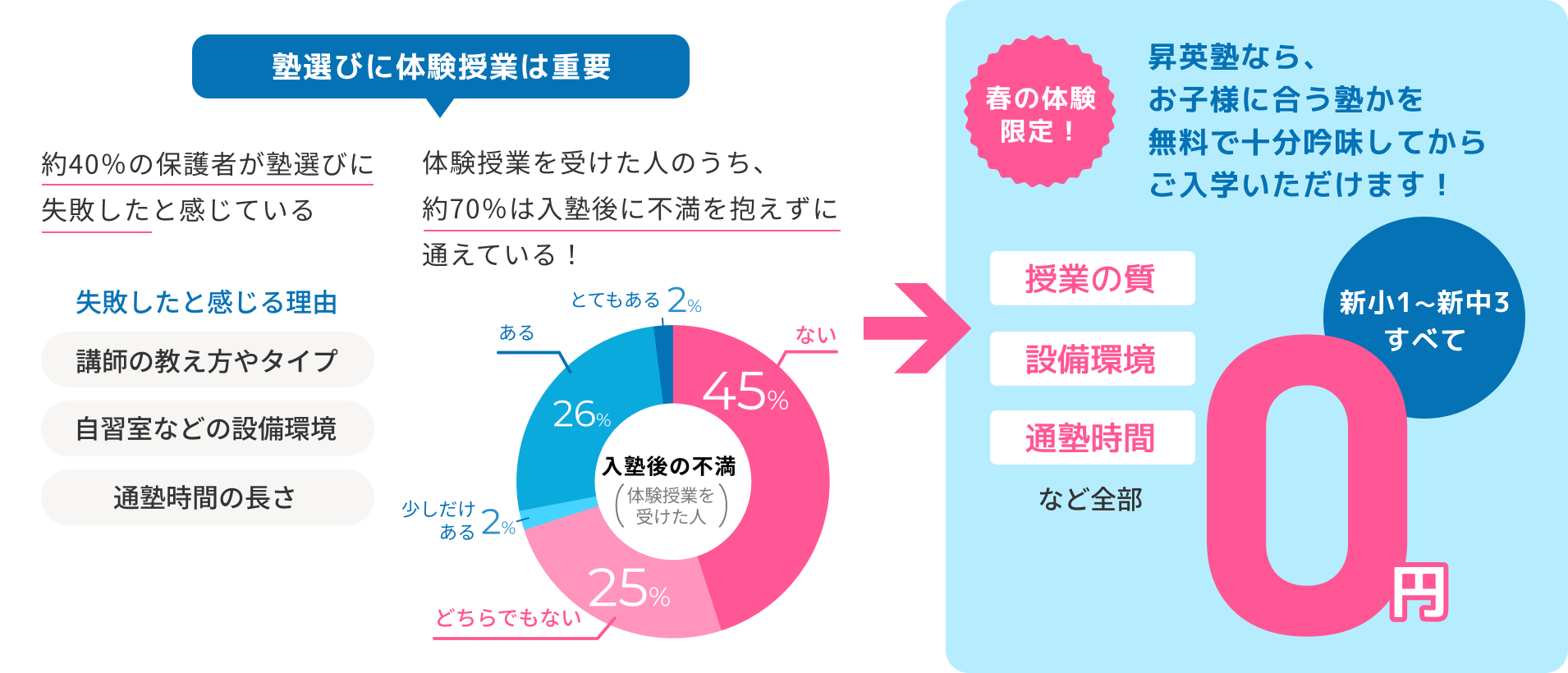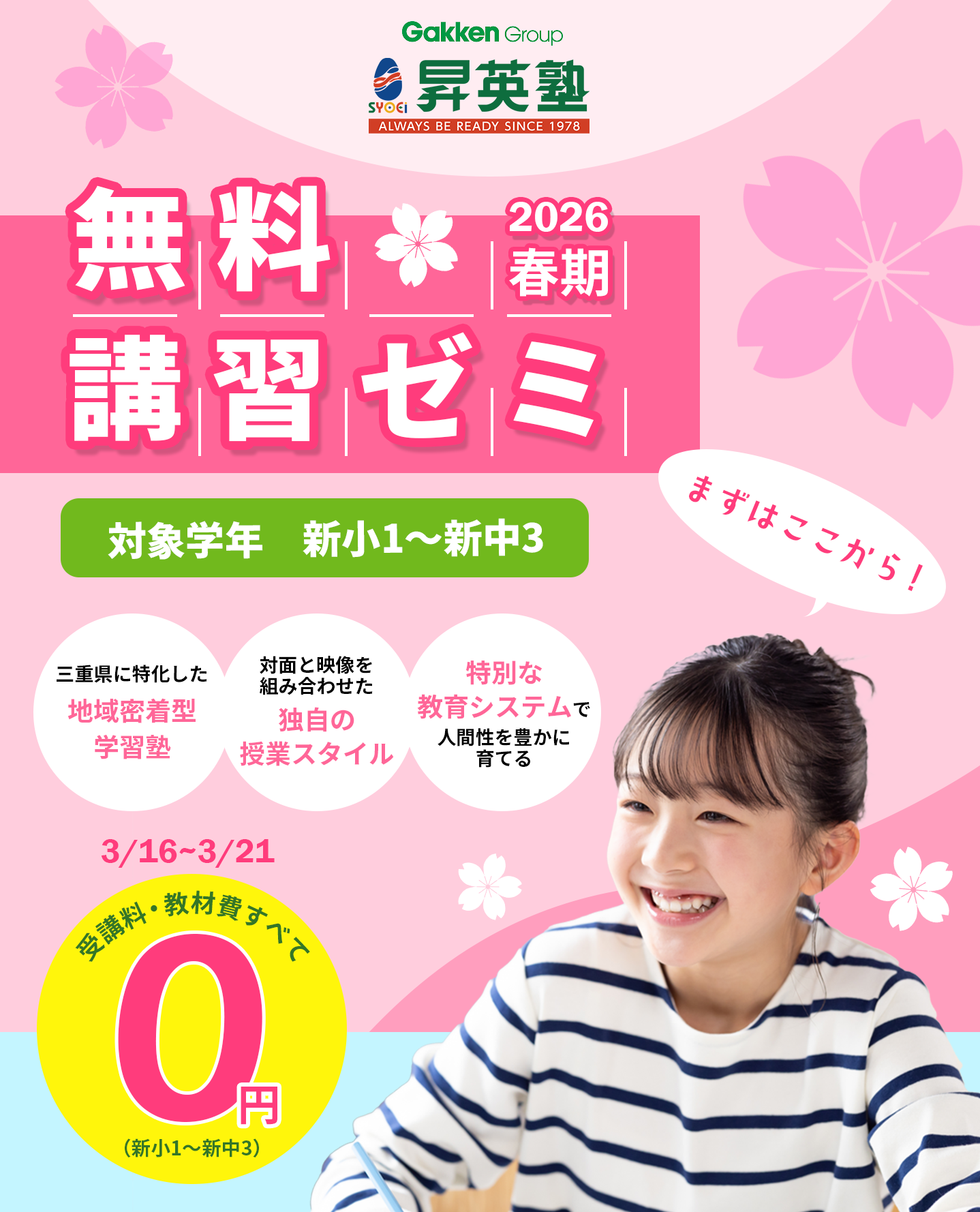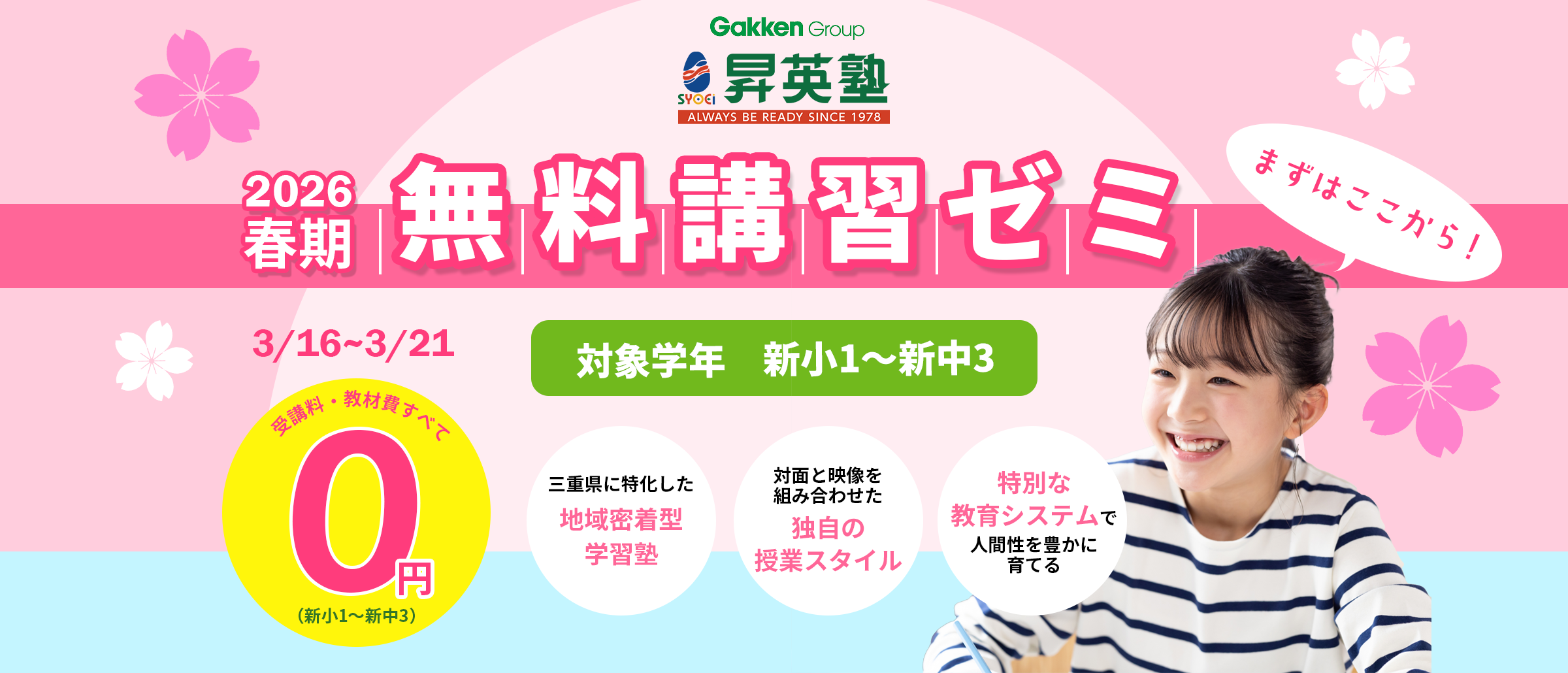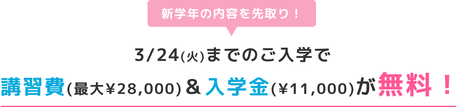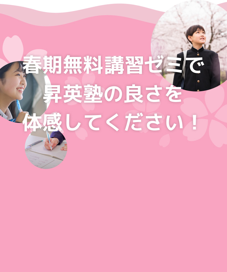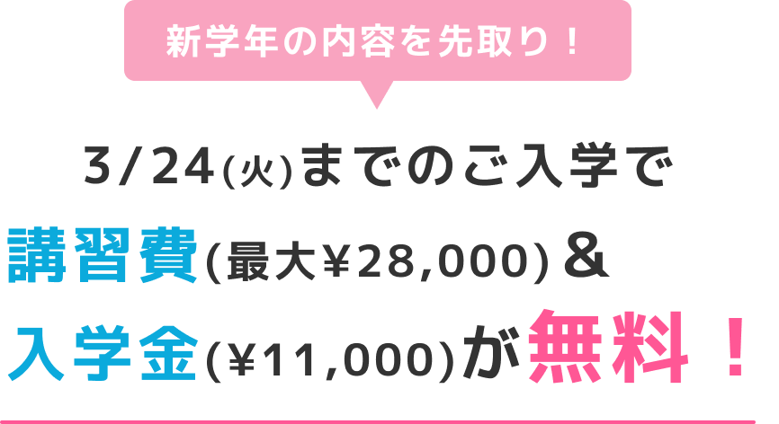 新学年が始まる前に塾を見つけておきたい!という方のために、春期講習より前に体験授業を実施します!昇英塾の体験は1回の授業だけでなく、最大4回の授業を無料で受けられます!さらに、3/24(火)までのご入学で春期講習費と入学金が無料に!