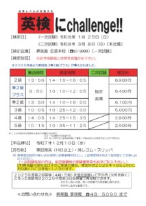 2025.11.17 お知らせ, トピックス 2025年度 第3回英検 2025年度 第3回英検の申込みが始まりました。 申込書は各校舎で用意しておりますので必要な場合は連絡ください。 一般の方も受験できます。事務局(0595-48-5090)までお問い合わせください。 ※受験申込締切は令和7年12月10日(水)です。